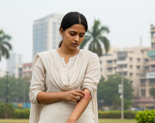 - A Delhi resident experiences repeated eczema flare-ups triggered by pollution and dry winter air, requiring regular moisturization and skin barrier repair.